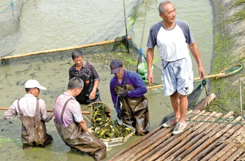 昨日清晨,浙江海宁市盐官镇养殖户王飞龙养殖塘边,众人忙碌帮着出塘黄颡鱼。据王飞龙说,七亩鱼塘预计产出9000公斤,现出塘价为每公斤21.6元,也算是个丰收年了。