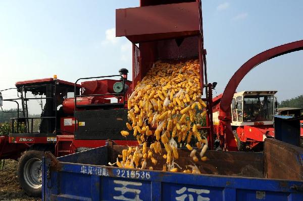 9月19日,安徽省亳州市涡阳县曹市镇农民在田间收割玉米。中秋时节,安徽、湖北、山东、山西等地的玉米、水稻等农作物正处于收获期,当地农民抓紧晴好天气进行抢收和晾晒,力保颗粒归仓,广袤的田野里到处是一派繁忙的秋收景象。