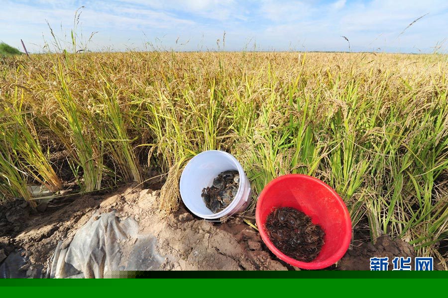 9月25日,在宁夏回族自治区贺兰县习岗镇新平村的有机稻田内,一位当地农民在展示稻田里长成的螃蟹。近日,宁夏回族自治区各地的水稻进入成熟期,记者在贺兰县走访时发现,这里的有机稻田实现了水稻、螃蟹立体种养的双丰收局面。据了解,2013年宁夏全区稻田养蟹面积为16万亩,贺兰县建立的稻蟹立体种养面积达5.2万亩,其中,万亩稻田养蟹示范园区3个,千亩稻田养蟹示范园区5个。预计农户亩均增收700元以上,真正实现了“稻蟹双赢”的目的。
