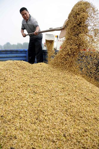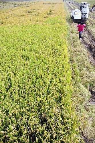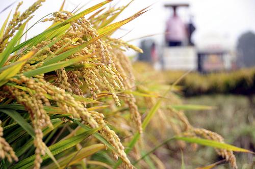 金秋时节,山东省临沂市郯城县10余万亩通过土地流转种植的水稻丰收开镰,预计平均亩产达630公斤。据县农业局负责人介绍,郯城是劳务输出大县,为了提高土地产出率,各乡镇采取“农民自愿、合理流转”的形式将农田向种田能手和“家庭农场”集中,并对承包户进行科技培训及栽培指导,科学种植,提高产量。新华社发(房德华 摄)