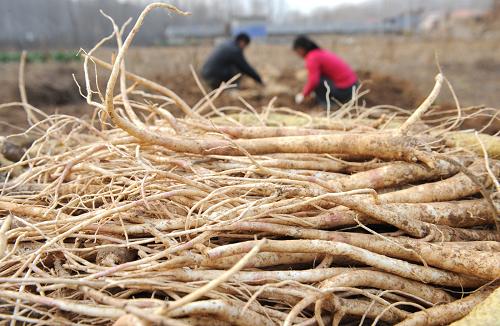 11月14日,山东省淄博市沂源县南鲁山镇茅台村的农民在收获桔梗。新华社发(赵东山 摄)