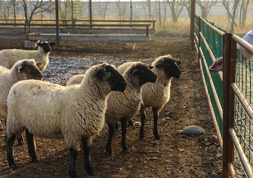 在新疆玛纳斯县振兴牧业合作社的一座羊圈内,几只萨福克羊在羊圈“晒太阳”(11月14日摄)。