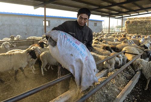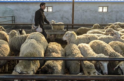 在新疆玛纳斯县振兴牧业合作社的一座羊圈内,一名工人在给羊群投喂草料(11月14日摄)。玛纳斯县是新疆着力扶持的十大肉羊产业发展示范县之一,每年出栏肉羊60多万只。