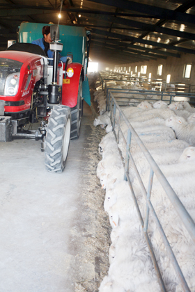 12月11日,在且末县吐拉牧场养殖小区,牧民正用机械为羊群投放饲料。