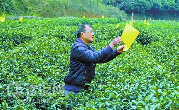 近日,灵山县农业局组织农技人员深入到各产茶区,大力推广茶园应用“黄板”和“诱虫灯”等绿色植保技术进行茶园病虫防治,减少农药使用,推进茶园生态系统良性发展,提高春茶品质。图为农技员正在观察茶园黄板诱虫效果。