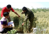 6月11日,温宿县农业部门技术人员正在小麦地里测产。
