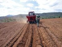 6月16日,在一二四团1连14号井350亩春小麦地里,一台高架机车载着大药车在喷施药剂。连队技术员李俊一边查看春小麦长势情况,一边向承包职工颜军梅讲解春小麦病虫害和预防干热风采取的措施即:亩用150克磷酸二氢钾、200克三唑酮和尿素100克配比50公斤水,喷洒在小麦叶面上,防止干热风,预防小麦倒伏和小麦锈病的发生。