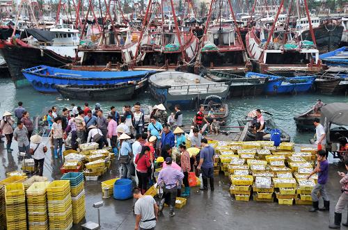 当日,广西北海市侨港码头迎来了南海伏季休渔期结束后远洋捕捞归来的渔船,码头上渔货肥美、商客云集。新华社发(李君光 摄)