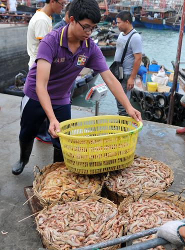 8月16日,渔民在广西北海市侨港码头搬运渔货。