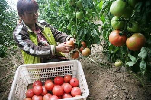 进入11月,延庆县各地早已秋风萧瑟,但井庄镇王木营蔬菜种植专业合作社的大棚里却是一片生机,西红柿、黄瓜等20余种蔬菜陆续成熟,开始供应蔬菜市场。图为工作人员正在采摘成熟的西红柿。