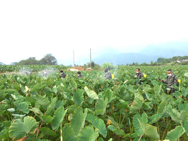 图为该合作社机防队队员在实行病虫害统防统治作业