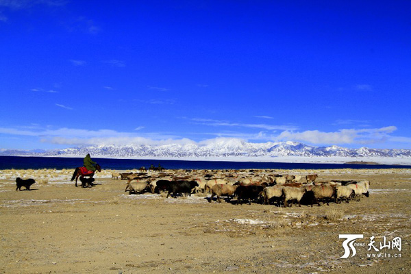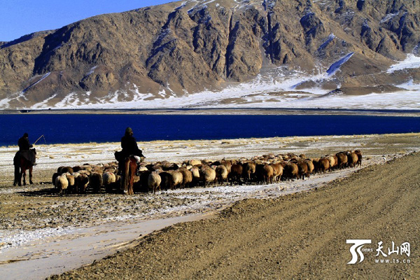 11月24日,初冬时节,湖水还未结冰,湖边有一些积雪,残留着一层半枯的牧草,无私地为过往的畜群提供着餐饭。仅从湖西到湖东,40多公里,畜群要走两天,牧人累了,或在马上打盹儿,或下马在草地上和衣而卧。牧民转场也冬去春来,一年两回,祖祖辈辈,一走几千年,这就是游牧生活。