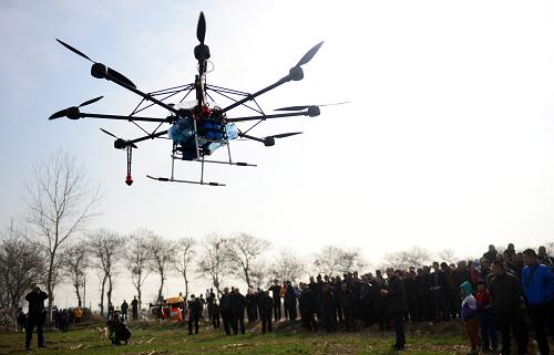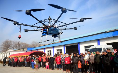 12月8日,人们在山西省永济市张营镇小姚村农机合作社观看一架多旋翼无人植保机的喷药示范作业。近日,山西省永济市农机部门从山东引进多旋翼无人植保机,在农民中推广用无人植保机为农作物喷药,受到当地农民的欢迎。新华社发(李向东摄)