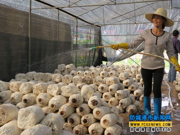 1月17日,在防城区华石镇冲敏蔬菜基地,防城区科农蔬菜种植专业合作社员工韦小芸正在给栽培的湖南姬菇浇水。该基地目前共栽培有20亩共10万棒低温品种食用菌,平均半个月可采摘一次,预计产量15~20万公斤,产值240~400万元。