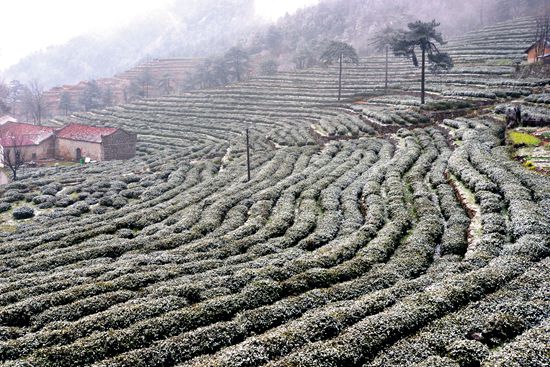 4月7日,大别山腹地岳西县包家乡石佛村高山茶园被白雪覆盖。伴随着强冷空气的袭击,该县气温骤降,包家、石关等高海拔乡镇均出现降雪。目前,该县15万余亩茶园均已开始采摘。突如其来的“倒春寒”,将使茶园因受冻害而减产。