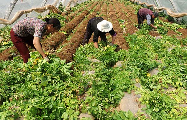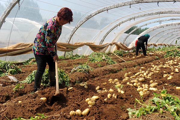 4月23日,山东省枣庄市峄城区古邵镇双楼村农民在采收三膜覆盖早春土豆。