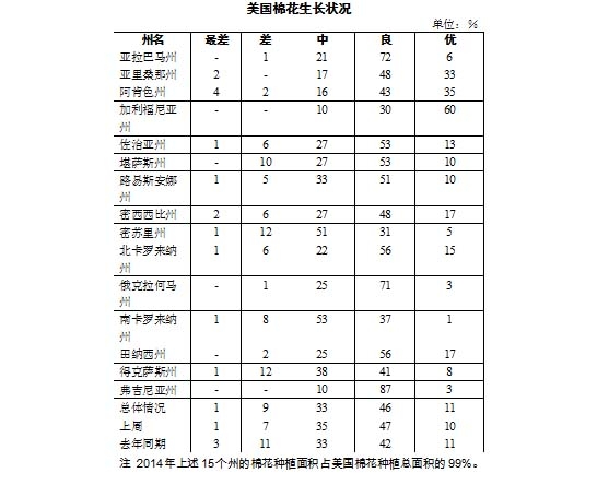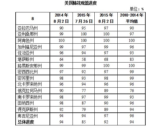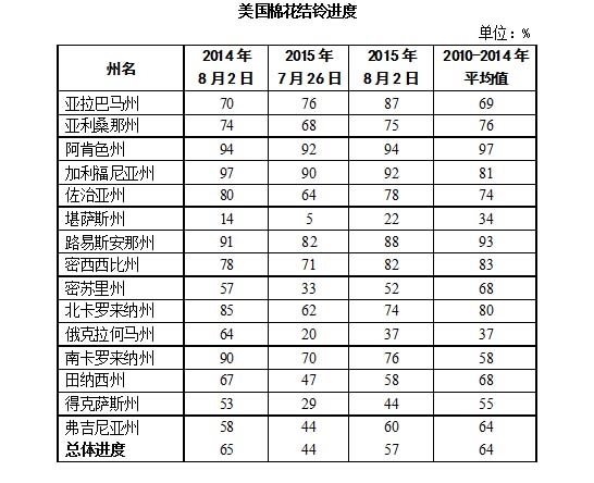 美国农业部8月3日发布的美国棉花生产报告显示,截至2015年8月2日,美国棉花现蕾率为92%,较前周增加7个百分点,较上年同期减少2个百分点,较过去五年同期减少2个百分点。美国棉花结铃率为57%,较前周增加13个百分点,较上年同期减少8个百分点,较过去五年同期减少7个百分点。美国棉花生长状况为良好以上的占57%,与上周持平,较去年同期增加4个百分点。