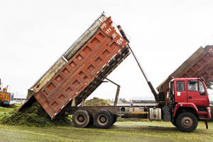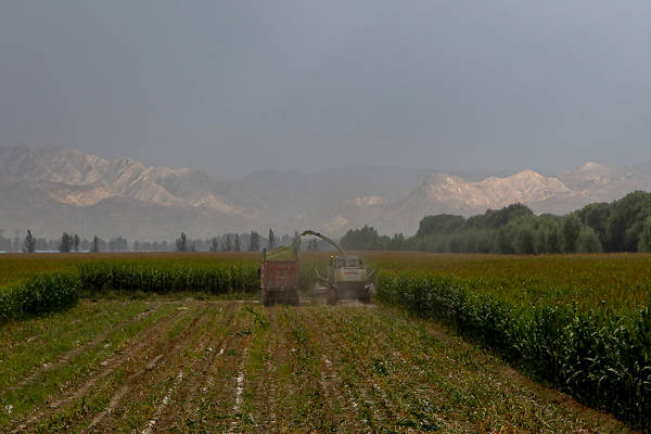 图为内蒙古呼和浩特市土默特左旗那什图玉米青贮种植基地和犇腾牧业公司双号牧场正在进行玉米青贮饲料的全程机械化作业,收割、粉碎、管道装载、运输、牧场卸载、铺平、喷洒添加剂、压实、密封、入窖,将在最短的时间内完成。 (本版图片 农业部网站记者 李卫东 摄)