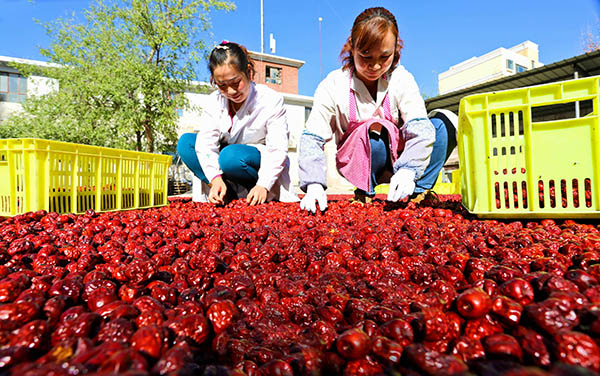 10月8日,甘肃省张掖市临泽县沙河镇兰堡村农业合作社的工作人员在挑选红枣。