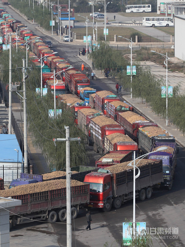 10月13日,甘肃定西一家淀粉加工企业门外,满载马铃薯的货车排队等待进入。