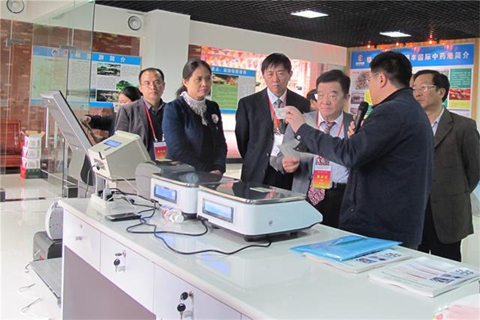 玉林中药材流通追溯体系管理中心挂牌,工作人员向出席活动的嘉宾介绍溯源案秤的工作原理