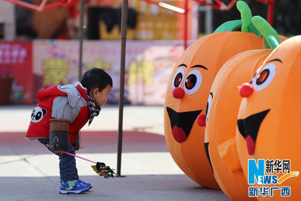 12月17日,广西融安县长安广场的“融安金桔”吉祥物吸引一名小朋友驻足。
