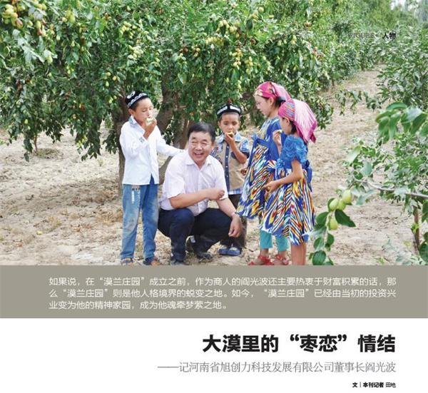 这位生于中原的硬汉、在业界以多谋善断而著称的知名企业家,为何放着效益俱佳的旭创力公司的规模扩张不做,却舍近求远、背井离乡,冒着极有可能“打水漂”的商业风险,在远离故土的新疆荒漠侠客般地“挥金如土”,倾力打造他的“和田漠兰庄园果业有限公司”?为何费尽心思架构他的“枣园帝国”?这种胆略和气魄来自何处?又是在什么境况下催生出了“漠兰庄园”这么一个既雅致又极具创意的名字?带着一连串的疑问,记者走近了这位堪称商业奇才的精英翘楚——阎光波。