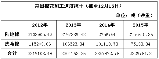 根据美国农业部(USDA)、美国国家农业统计局(NASS)统计的数据显示,截至2015年12月15日,美棉加工进度完成79%,累计加工量2229784.2吨,同比减少628088.6吨,下降幅度22%。陆地棉加工量2154645.36吨,同比减少602108.6吨,下降幅度22%;皮马棉加工量75138.84吨,同比减少25979.94吨,下降幅度为26%。