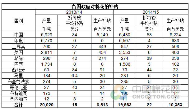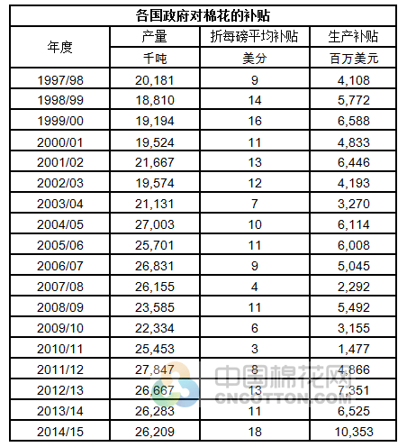 国际棉花咨询委员会(ICAC)的分析报告称,2014/15年度全球各国对棉花行业的补贴(包括生产直补、边界保护、作物保险补贴和最低支持价格)总额达到创纪录的104亿美元,高于2013/14年度的65亿美元。12个国家为棉花行业提供了补贴,平均补贴为22美分/磅,高于2012/13年度的15美分/磅。