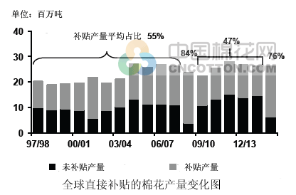 根据ICAC的统计,享受政府直接支持的产量占全球棉花总产量的比重从1997/98 -2007/08年度的平均55%提高到2008/09年度的83%。从2009/10年度到2013/14年度,这个比重下降到47%。2013/14年度,享受补贴的产量占总产量的比重为44%,但2014/15年度预计提高到76%。
