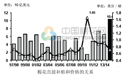 根据ICAC近15年的跟踪记录,从1997/98年度至今,棉花补贴和棉花价格有很强的负相关性,即棉价高时补贴较少,而棉价低时补贴较高,2014/15年度维持了这个趋势。考特鲁克A指数平均值从2013/14年度的91美分下跌到2014/15年度的71美分,同期,全球棉农得到的补贴增加。