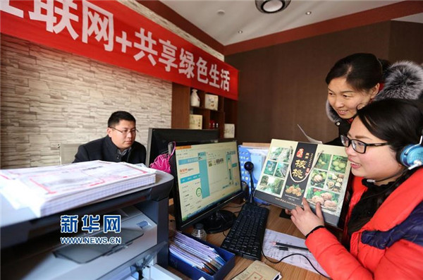 2016年1月26日,河南省林州市东岗镇万宝山农副产品网络销售平台,工作人员手持“东岗核桃”正在与北京一大客户做线上互动并顺利下单、发货。