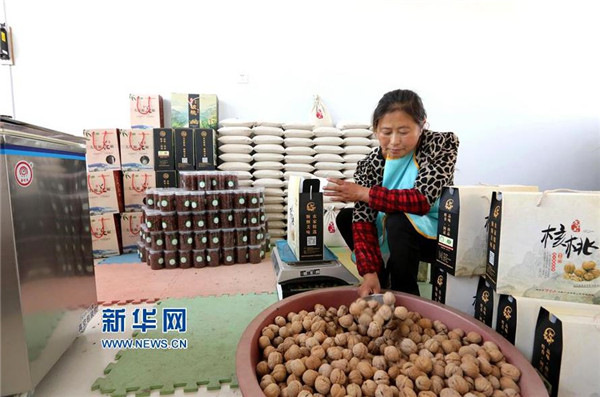 河南省林州市万宝山农副产品有限公司生产基地包装车间,工作人员正在把加工好的核桃干果进行精细包装(2015年10月5日拍摄)。