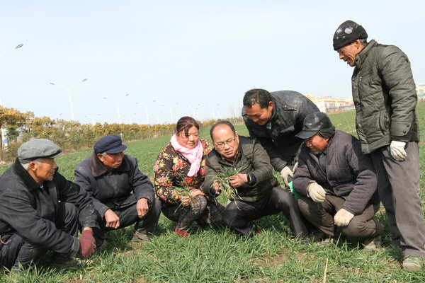 2月14日,濉溪县五沟镇农技人员在麦田里分析苗情,指导农民开展田间管理。