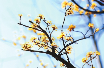 3月14日,在深山区河南汝阳县靳村乡,蓝天下金灿灿的山茱萸格外美丽。 近年来,该县结合山区地理优势,积极引导扶持山区乡农民发展中药材山茱萸。每逢春季,漫山遍野的山茱萸花,构成一道美丽的风景线。