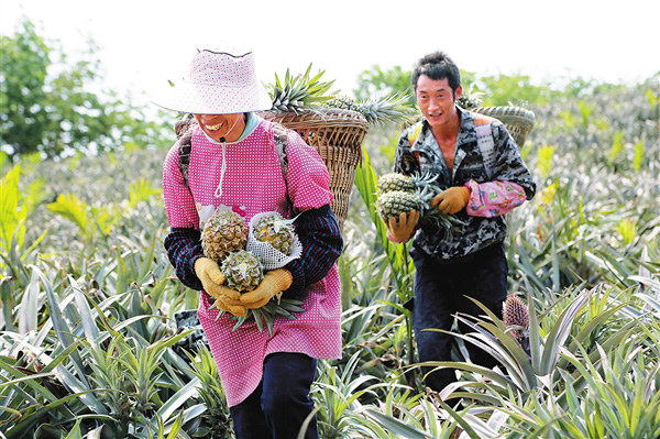 图为工人正在该镇水坡村一处菠萝地采摘菠萝。
