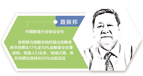 那么,粮食库存多少合适呢?按照联合国粮农组织提出的粮食库存消费比,17%至18%是粮食安全警戒线,超过或者低于这个警戒线,都属于不安全因素。我国人口众多,地域辽阔,主销区和产销平衡区还没有完全解决粮食安全问题,从长期的粮食供需情况看,我国粮食的库存消费比保持在50%比较适宜,甚至还可以再高一点。这样库存水平即可保证国家粮食安全对用粮的需求,同时对调控市场保持合理价格水平,兼顾粮食生产者、消费者和用粮企业各方利益,回旋余地也比较大。目前我国粮食库存消费比远远高于这一水平。