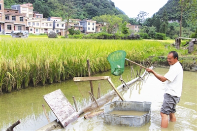 图为明伦镇龙水屯村民卢世盟在自家稻田捕捞禾花鱼。