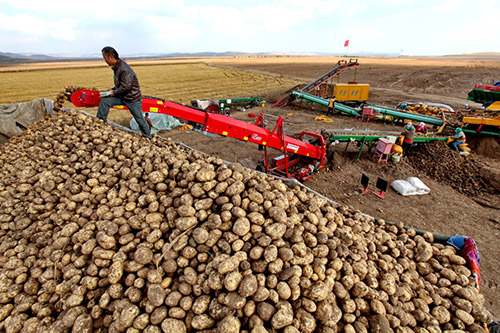 10月7日,张家口市塞北管理区的工人在使用机械设备将收获的马铃薯装车外销。