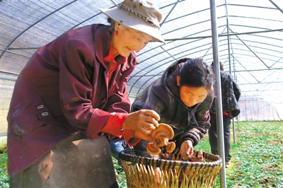 图为巴宜区朗欧村贫困户布久(左)在朗欧村精准扶贫项目——灵芝种植大棚内与其他村民一起采摘灵芝。