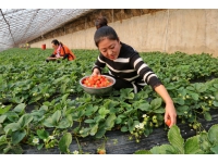 迎新合作社的80个草莓大棚显得十分气派,走进去,只见一株株绿油油的草莓架,点缀着些红色的果实,非常好看。游客走到田埂间仔细地搜寻着红色的草莓,“这有一个,快来!”游客们畅快开心地大叫,将一颗红色的草莓摘到了盒子里。“这是她第一次来采摘草莓,虽然以前也带孩子采摘过几次蔬菜,但从来没有在冬季采过草莓,这草莓的味道果然和市场上买的不一样,口感很好。”一位来自市区的游客高兴地说。