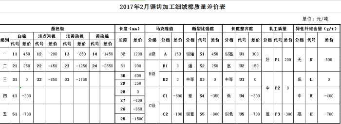 根据2017年1月棉花市场监测数据,与上月相比,本月对《锯齿加工细绒棉质量差价表》做出以下调整: