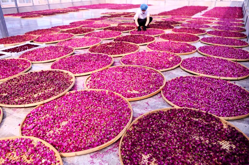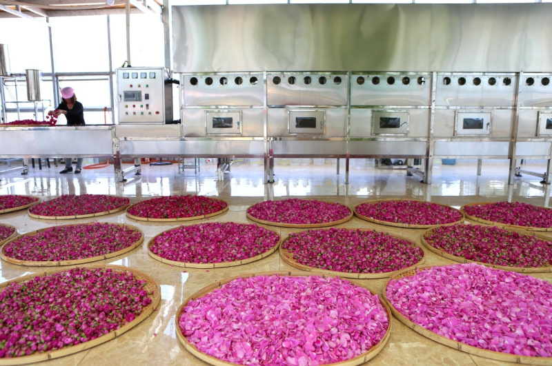 5月17日,山东省即墨市灵山镇“玫瑰小镇”产业园的农民在加工玫瑰花茶。