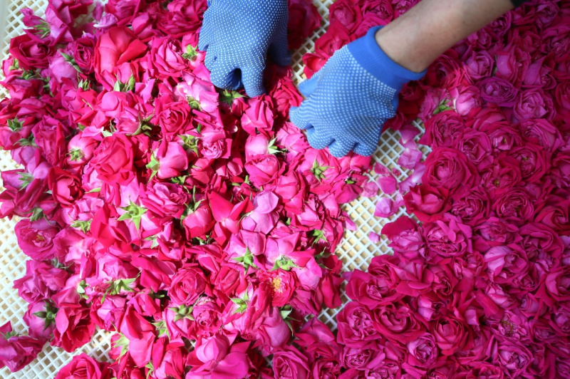5月17日,山东省即墨市灵山镇“玫瑰小镇”产业园的农民在加工玫瑰花。