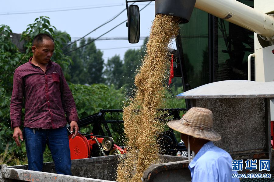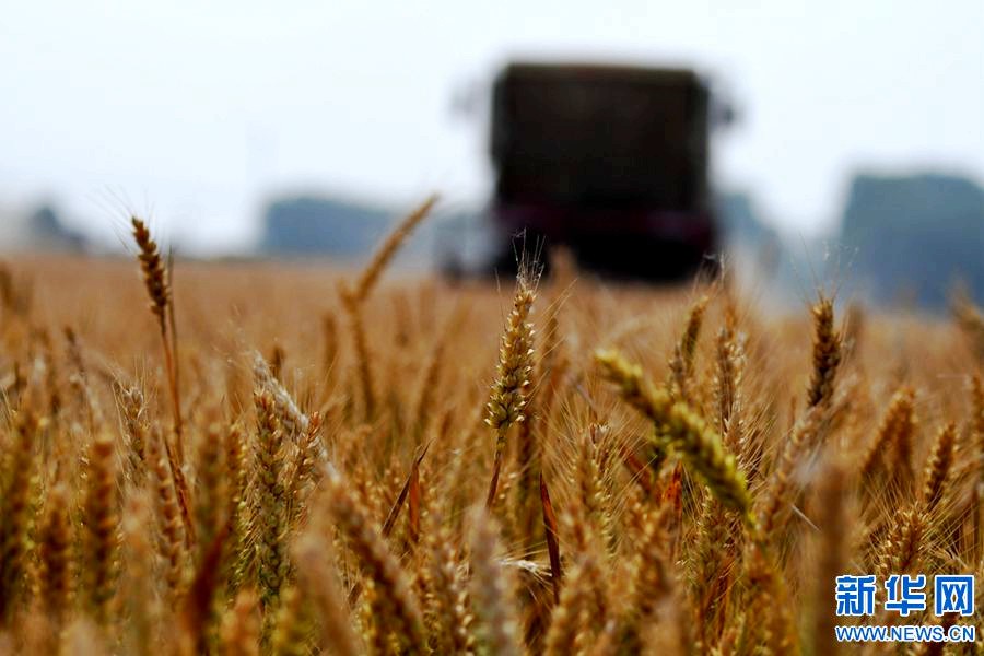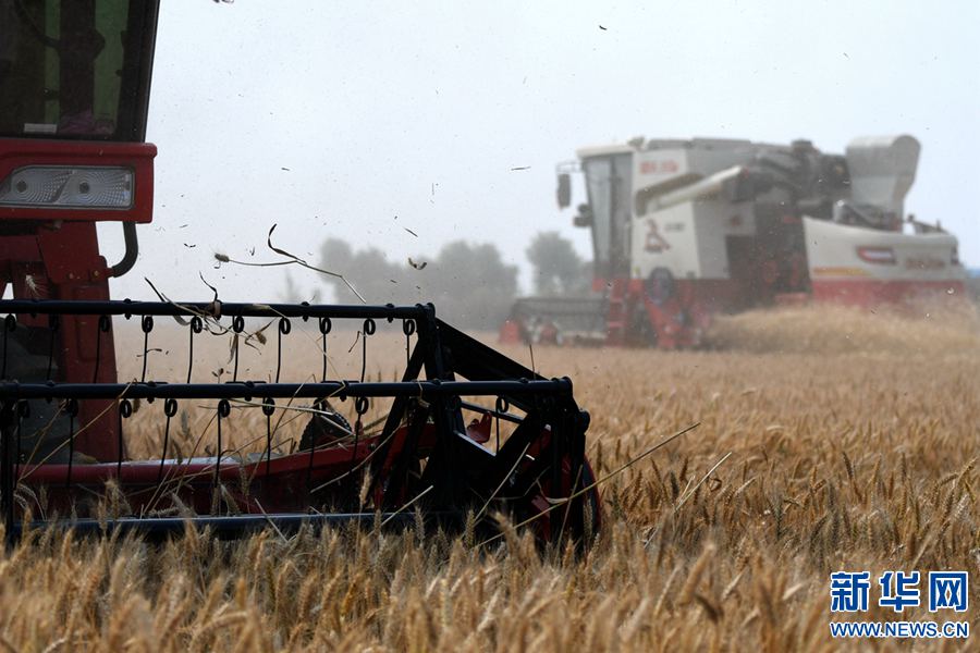 据悉,卧龙区种植的62万亩小麦已陆续进入收割期,由于今年日照充分,雨水充足,该地小麦长势喜人,预计亩产可达800—1000斤。新华网发(陈辉 摄)