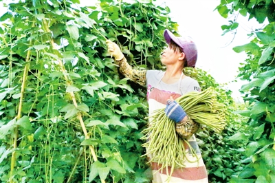 5月28日傍晚,新兴县车岗镇布马村农民曾大婶在自家的菜地采摘豆角。曾大婶告诉笔者,她家有1亩菜地,四季都种有应季的蔬菜。