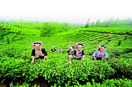 普安县江西坡茶业现代高效农业示范园区工作人员在采摘茶叶。