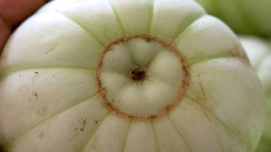 记者仔细端详眼前的一只只小白瓜,只见其矮墩墩的个头,上端窄、下端宽,外形似一只只“地雷”,瓜皮呈白色,瓜身分布11条青筋,将其分隔成一棱一棱的,煞是好看。“在没成熟时,瓜的外皮全部是淡绿色的,但随着瓜逐渐成熟,就慢慢从下到上转成了白色,雪白雪白的……”