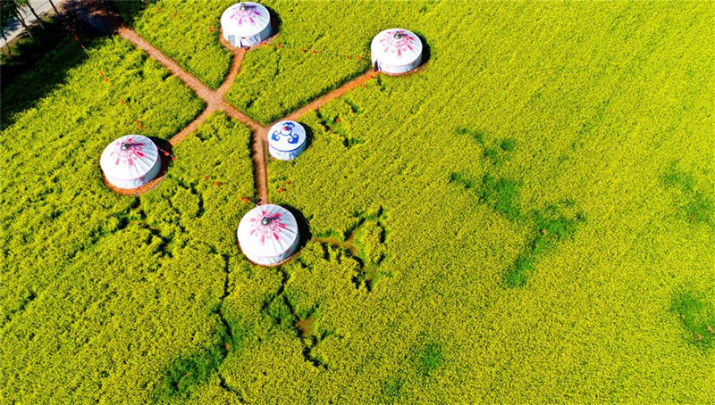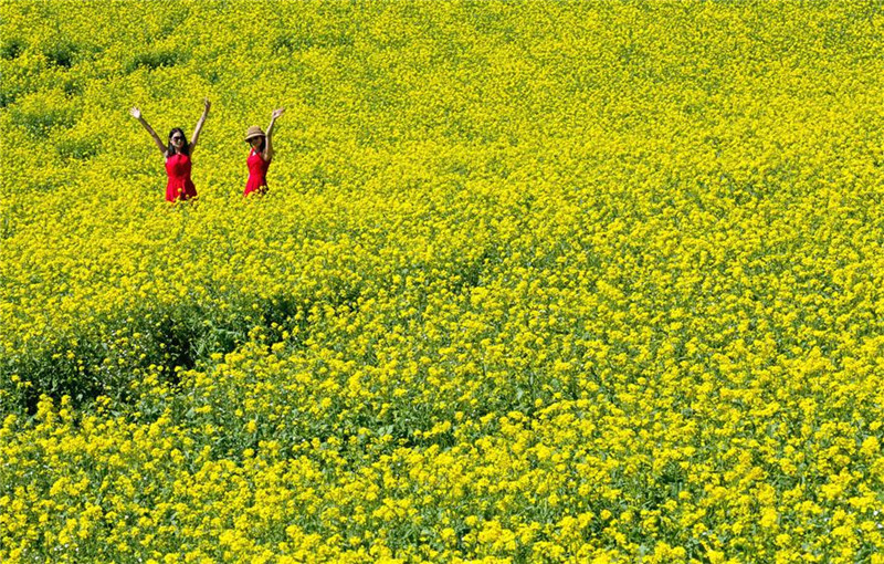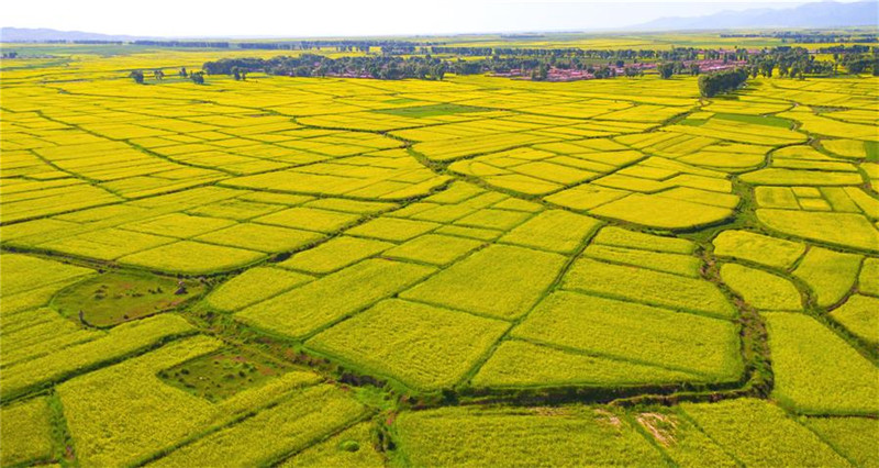 近日,甘肃省张掖市民乐县种植的十万亩油菜花进入盛花期。放眼望去,金色的油菜花与蓝天白云相互映衬,构成一幅美丽的画卷,吸引众多游客前来观光游览。新华社发(王将 摄)