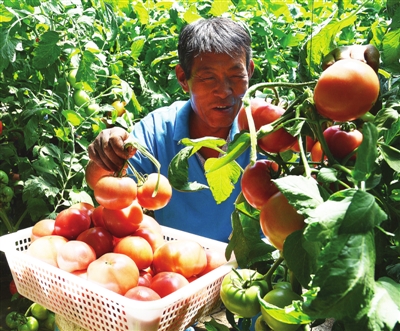 图为青水源农民正在采摘西红柿。 连日来,本市农口区蔬菜种植基地的农民冒着高温在蔬菜大棚采摘新鲜蔬菜,保证蔬菜市场供应。